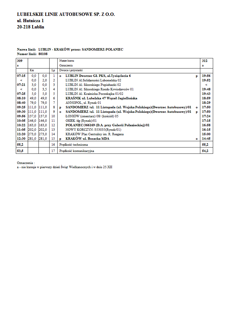 Uprzejmie informujemy, że od dnia 01.10.2017 roku uruchamiamy nową linię komunikacyjną LUBLIN – KRAKÓW przez: SANDOMIERZ, POŁANIEC. Kursy w ramach przedmiotowej linii będą realizowane codziennie (oprócz pierwszego dnia Świąt Wielkanocnych i 25.XII) zgodnie z załączonym rozkładem jazdy w godzinach:
